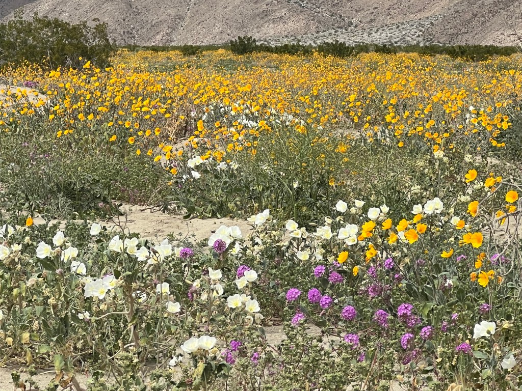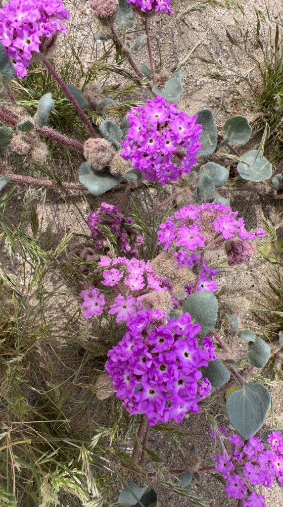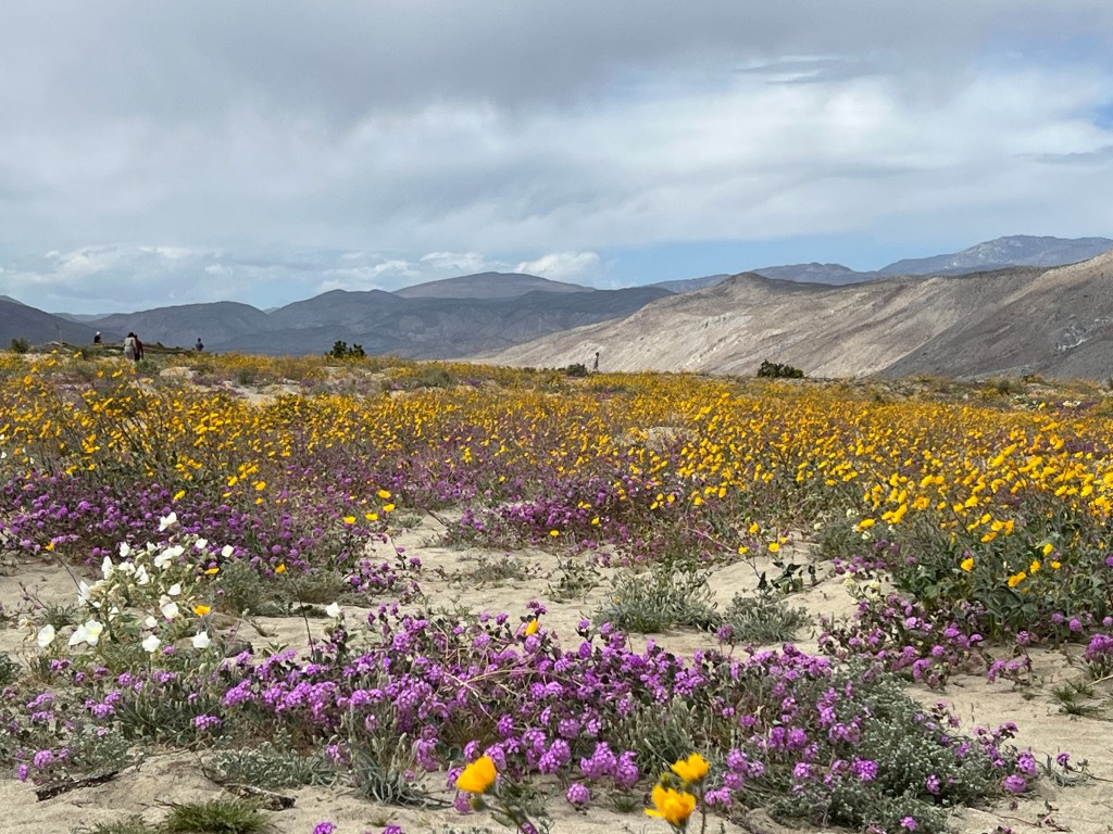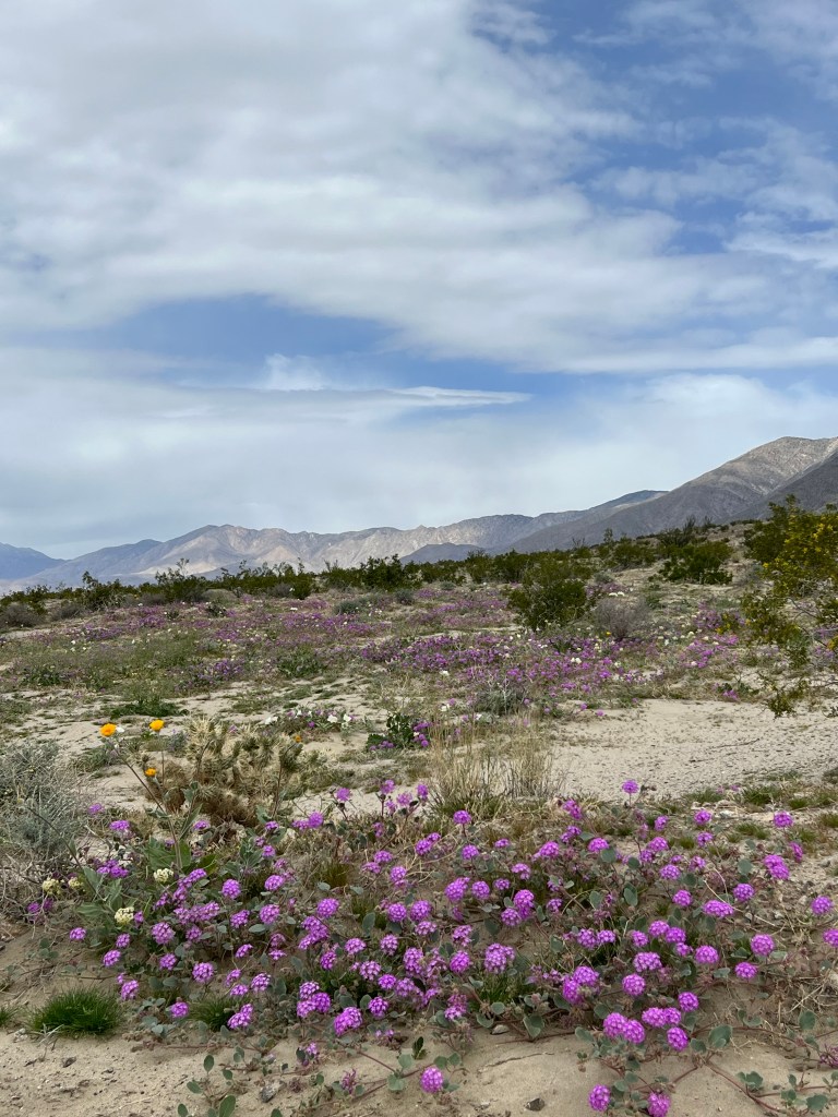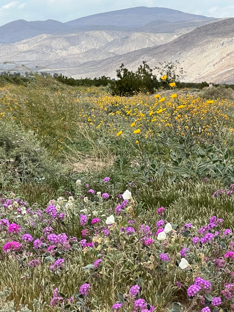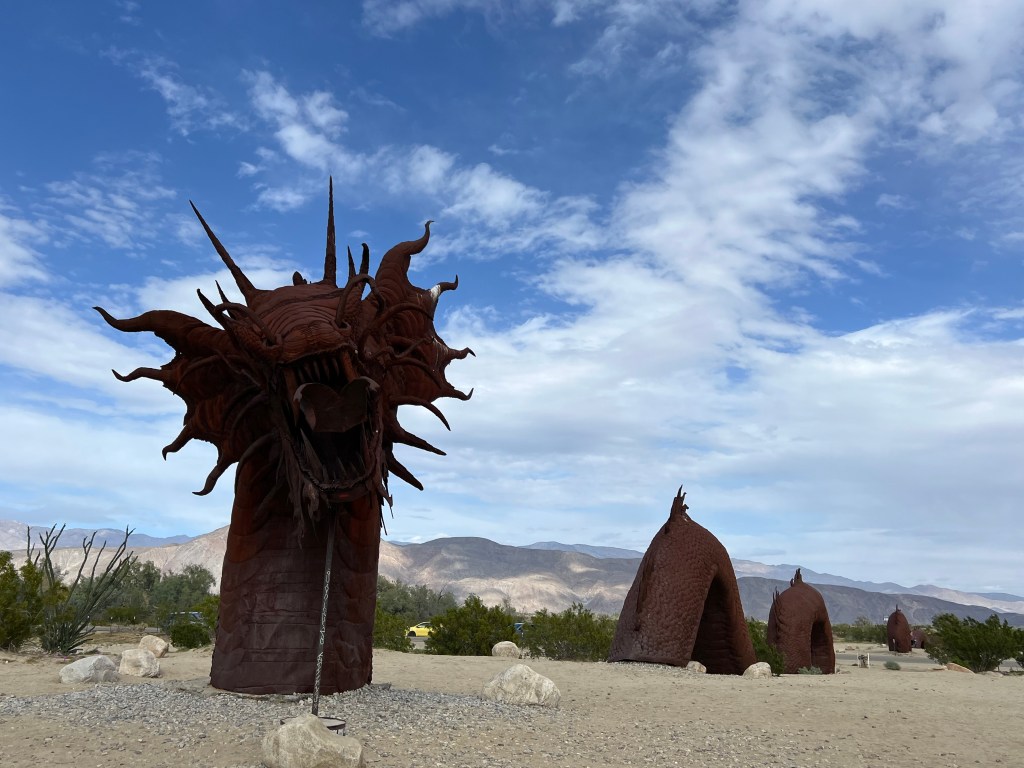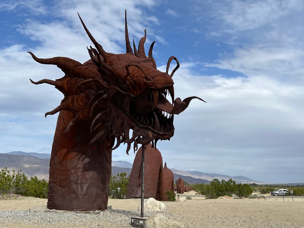 I took a short trip to Anza Borrego State Park on March 14-16th to commune with the wildflowers. Ralph Waldo Emerson wrote that “…the earth laughs in flowers,” and right now, the Anza Borrego desert is filled with laughter. I spent a night in Indio, since I couldn’t afford any of the places in Anza Borrego, and then ventured a little north, but bloom-wise, Anza Borrego was the place to be. I’d only been here once, in 2015, when there were also many wildflowers blooming, and my housemate and I serendipitously discovered the Galeta Meadows sculptures, and this trip, I revisited a couple of my favorites. They’re on private land, but the owner is generous enough to allow the public to visit.